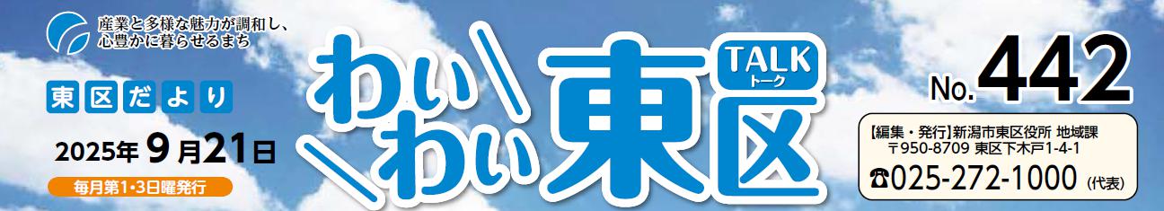 その他のお知らせ(わいわい東区 (令和7年9月21日)) ■室内でも、外出時でも、こまめに水分・塩分などを補給して、熱中症に注意しましょう。 ■広告掲載の申し込みは地域課(【電話】025-250-2130)へ、1枠(3.9cm×7.9cm)15,000円。掲載した広告についての問い合わせは各広告主へ。 ■東区だより「わいわい東区」 2025年9月21日 No.442 毎月第1・3日曜発行 編集・発行:新潟市東区役所 地域課 〒950-8709 東区下木戸...