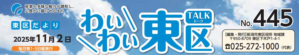 その他のお知らせ(わいわい東区 (令和7年11月2日)) ■東区役所にて、11月17日(月)まで東区中学校・高等学校 まんなか文化祭開催中! 体育祭応援パネルや美術部の作品を展示しています。 ■広告掲載の申し込みは地域課(【電話】025-250-2130)へ、1枠(3.9cm×7.9cm)15,000円。掲載した広告についての問い合わせは各広告主へ。 ■東区だより「わいわい東区」 2025年11月2日 No.445 毎月第1・3日曜発行 編集・発行:新潟...