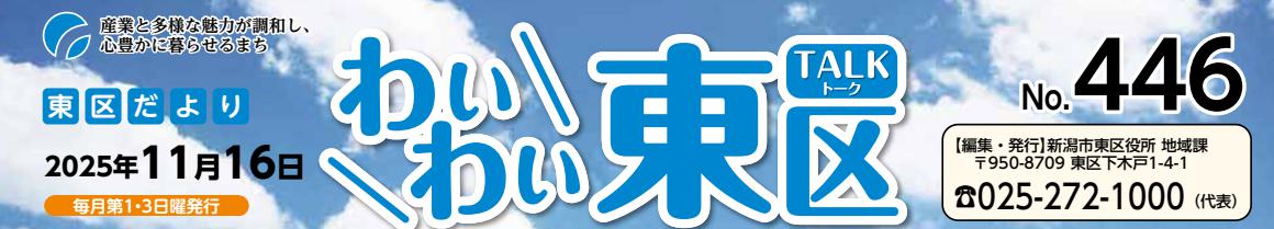 その他のお知らせ(わいわい東区 (令和7年11月16日)) ■東区だよりにお店や会社の広告を掲載しませんか。 対象は、「区内に本社や営業所がある事業者」です。詳しくはこちら ※詳細は本紙をご覧ください。 ■東区だより「わいわい東区」 2025年11月16日 No.446 毎月第1・3日曜発行 編集・発行:新潟市東区役所 地域課 〒950-8709 東区下木戸1-4-1 【電話】025-272-1000(代表)