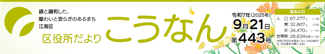 その他のお知らせ(区役所だよりこうなん 令和7年9月21日号) ◆犬の放し飼いは絶対にやめましょう。また、犬の散歩時のフンは飼い主が責任を持って確実に後始末をお願いします。 問い合わせ:区民生活課 生活環境係 (【電話】025・382・4254) ◆マイナンバーカードの受け取りは、交付通知書が届いたらお早めに(要予約) 問い合わせ:区民生活課 (【電話】025・382・4203) ◆≪区バス≫江南区の区バス(アスパーク亀田~亀田駅西口~イオンモール新潟亀田イン...