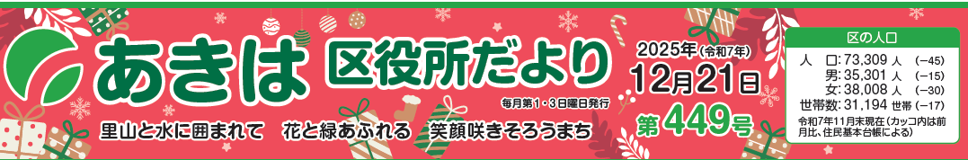 秋葉区の1年を振り返って 令和7年も残すところあとわずかになりました。「こども真ん中の秋葉区づくり」を目指した、地域中心の様々な活動により、こどもたちの笑顔の花がいっぱい咲いた年となりました。 今号では、秋葉区の今年1年の出来事を写真とともに振り返ります。 ◆たくさんの楽しいイベント開催! ・にいつ夏まつり ・小須戸燈籠押合いまつり ・あきはなびまつり ・産業祭 ・にいつまるごと鉄道フェスタ ◆秋葉区PR大使誕生! 秋葉区...