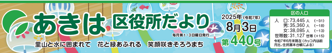 その他のお知らせ(あきは区役所だより 令和7年8月3日号) ◆電話番号は市外局番0250を省略しています ◆秋葉区の魅力を発信しています!秋葉区公式インスタグラムは二次元コードから ◆気温の高い日が続いています 食事・睡眠を十分にとり、喉が渇いていなくても小まめに水分を補給しましょう ***** 里山と水に囲まれて 花と緑あふれる 笑顔咲きそろうまち あきは区役所だより 2025年(令和7年)8月3日 第440号 毎月第1・3日曜日発行 編集・発行:新潟市...