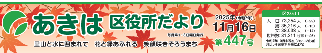 その他のお知らせ(あきは区役所だより 令和7年11月16日号) ◆電話番号は市外局番0250を省略しています ◆弥生の丘展示館で企画展「最新の調査成果から探る古津八幡山遺跡」開催中!3月8日(日)まで ◆新潟県内「クマ出没特別警報」発令中!クマのエサとなる生ゴミや不要な果樹は放置せず早めの処分を ***** 里山と水に囲まれて 花と緑あふれる 笑顔咲きそろうまち あきは区役所だより 2025年(令和7年)11月16日 第447号 毎月第1・3日曜日発行 編集・...