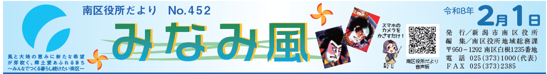その他のお知らせ(南区役所だより「みなみ風」令和8年2月1日号) ◆2月8日(日)は衆議院議員総選挙および最高裁判所裁判官国民審査投票日です。2月7日(土)まで期日前投票ができます。 選挙当日に投票に行けない人は、期日前投票をしましょう。 問い合わせ:選挙管理委員会 【電話】372-6421 ***** 風と大地の恵みに新たな希望が芽吹く、郷土愛あふれるまち~みんなでつくる暮らし続けたい南区~ 南区役所だより みなみ風 令和8年2月1日 No.452 発行:新潟...