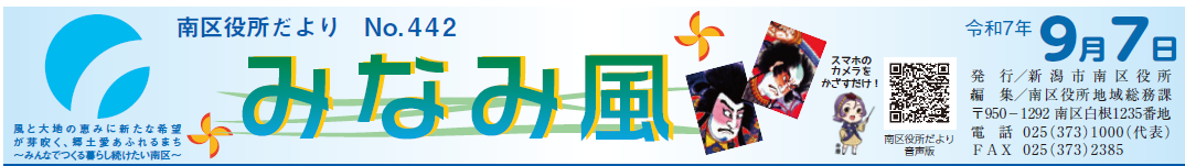 その他のお知らせ(南区役所だより「みなみ風」令和7年9月7日号) ◆「伝えたい南区の”宝”いいとこ撮りコンテスト」凧合戦部門の応募作品を9月30日(火)まで「しろね大凧と歴史の館」に展示しています。ぜひご覧ください! 問い合わせ:地域総務課 【電話】372-6621 ***** 風と大地の恵みに新たな希望が芽吹く、郷土愛あふれるまち~みんなでつくる暮らし続けたい南区~ 南区役所だより みなみ風 令和7年9月7日 No.442 発行:新潟市南区役所 編集:南区役所...