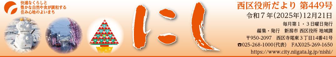 その他のお知らせ(西区役所だより「にし」 (令和7年12月21日)) 快適なくらしと 豊かな自然や食が調和する 住み心地のよいまち 西区役所だより 毎月第1・3日曜日 発行 令和7年(2025年)12月21日 第449号 編集・発行:新潟市 西区役所 地域課 〒950-2097 西区寺尾東3丁目14番41号 【電話】025-268-1000(代表)【FAX】025-269-1650 【HP】https://www.city.niigata.lg.jp/nishi/ ...