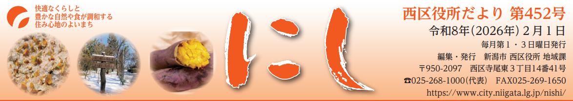 その他のお知らせ(西区役所だより「にし」 (令和8年2月1日)) 快適なくらしと 豊かな自然や食が調和する 住み心地のよいまち 西区役所だより 第452号 令和8年(2026年)2月1日 毎月第1・3日曜日 発行 編集・発行:新潟市 西区役所 地域課 〒950-2097 西区寺尾東3丁目14番41号 【電話】025-268-1000(代表)【FAX】025-269-1650 【HP】https://www.city.niigata.lg.jp/nishi/ ★...