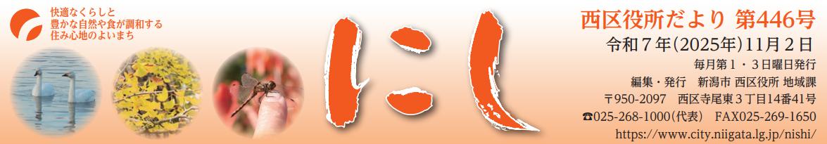 その他のお知らせ(西区役所だより「にし」 (令和7年11月2日)) 快適なくらしと 豊かな自然や食が調和する 住み心地のよいまち 西区役所だより 毎月第1・3日曜日 発行 令和7年(2025年)11月2日 第446号 編集・発行:新潟市 西区役所 地域課 〒950-2097 西区寺尾東3丁目14番41号 【電話】025-268-1000(代表)【FAX】025-269-1650 【HP】https://www.city.niigata.lg.jp/nishi/ ★...