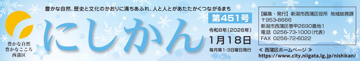 その他のお知らせ(西蒲区役所だより「にしかん」 (令和8年1月18日)) 豊かな自然、歴史と文化のかおりに満ちあふれ、人と人とがあたたかくつながるまち 豊かな自然 豊かなこころ 西浦区 ※問い合わせ・申し込みの際は、電話番号のかけ間違いがないようご注意ください。 にしかん 第451号 令和8年(2026年)1月18日 毎月第1・3日曜日発行 [編集・発行] 新潟市西蒲区役所 地域総務課 住所:〒953-8666 新潟市西蒲区巻甲2690番地1 【電話】0256-73-1...