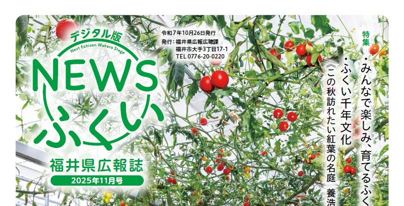 その他のお知らせ (NEWSふくい 76号) ■NEWSふくい デジタル版 福井県広報誌 2025年11月号 令和7年10月26日発行 発行:福井県広報広聴課 福井市大手3丁目17-1 【電話】0776-20-0220 ■県公式SNS 人気のイベントやお得なキャンペーンなど、県政の新鮮な情報をお届けします。 ・LINE「福井県」 ・X「福井県広報広聴課」 ・Instagram「ほやほや福井」 ※詳しくは本紙をご覧ください。