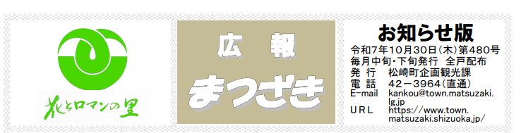 その他のお知らせ(広報まつざき お知らせ版 第480号 令和7年10月30日(木)) ■広報まつざきお知らせ版 令和7年10月30日(木)第480号 毎月中旬・下旬発行 全戸配布 発行:松崎町企画観光課 【電話】42-3964(直通) 【E-mail】[email protected] 【URL】https://www.town.matsuzaki.shizuoka.jp/