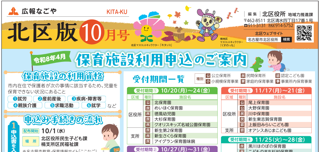 令和8年4月 保育施設利用申込のご案内(2) ◆受付期間一覧 ◎受付期間(1):10月20日(月曜日)から24日(金曜日) 区域:区役所 種別:公立保育所 施設名:北保育園 区域:区役所 種別:民間保育所 施設名:めいほく保育園 区域:区役所 種別:民間保育所 施設名:徳風幼児園 区域:区役所 種別:民間保育所 施設名:大杉保育園 区域:区役所 種別:民間保育所 施設名:クオリスキッズ名城公園保育園 区域:支所 種別:民間保育所 施設名:新生...