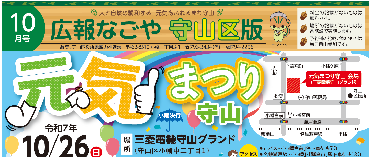 元気まつり守山 小雨決行 令和7年10月26日(日曜日)午前10時から午後3時 場所:三菱電機守山グランド(守山区小幡中二丁目1) 開催の有無は当日午前8時から名古屋おしえてダイヤル(【電話】052-953-7584)まで ウェブサイトもご利用ください ◆アクセス ・市バス…「小幡宮前」停下車徒歩7分 ・名鉄瀬戸線…「小幡」・「瓢箪山」駅下車徒歩13分 ・ゆとりーとライン…「川宮」・「川村」停下車徒歩16分 ◆元...