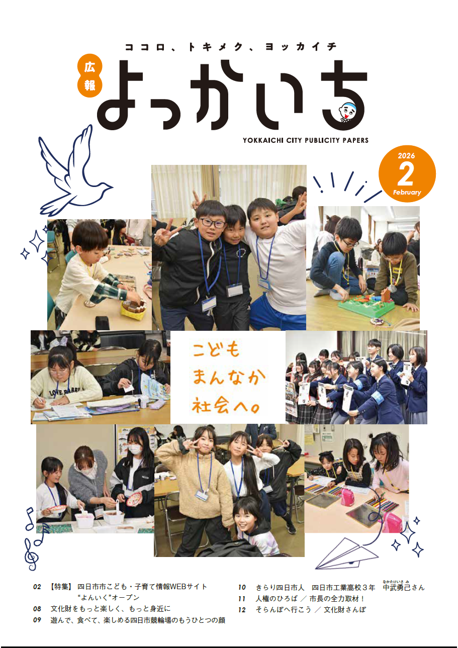 その他のお知らせ(広報よっかいち 2月上旬号NO.1686) ■表紙 ■広報よっかいち2月上旬号 No.1686(令和8年2月5日発行) 編集・発行/四日市市広報マーケティング課 〒510-8601 四日市市諏訪町1番5号 【電話】059-354-8104(総合案内) 印刷:水九印刷株式会社