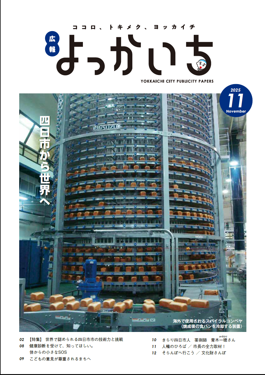 その他のお知らせ(広報よっかいち 11月上旬号NO.1680) ■表紙 「四日市から世界へ」 海外で使用されるスパイラルコンベヤ (焼成後の食パンを冷却する装置) ■広報よっかいち11月上旬号 No.1680(令和7年11月5日発行) 編集・発行/四日市市広報マーケティング課 〒510-8601 四日市市諏訪町1番5号 【電話】059-354-8104(総合案内) 印刷:水九印刷株式会社