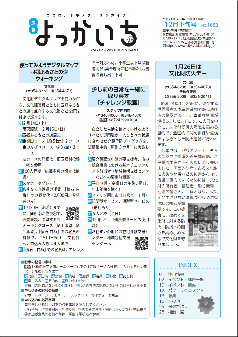 記事の記号の意味/申し込みの記号の意味/申し込みの必要事項 ■記事の記号の意味 [HP][ID]13桁の数字を市ホームページ右下の「広報ページID検索」に入力すると関連ページを検索できます 対…対象 時…日時 所…会場 内…内容 師…講師 定…定員 料…料金 持…持ち物 申…申し込み 他…その他 問…問い合わせ先 ※費用の記載がないものは無料、申し込み方法の記載がないものは申し込み不要 ■申し込みの記号の意味 ○ホ…ホームページ ○E…Eメール ○F…ファ...