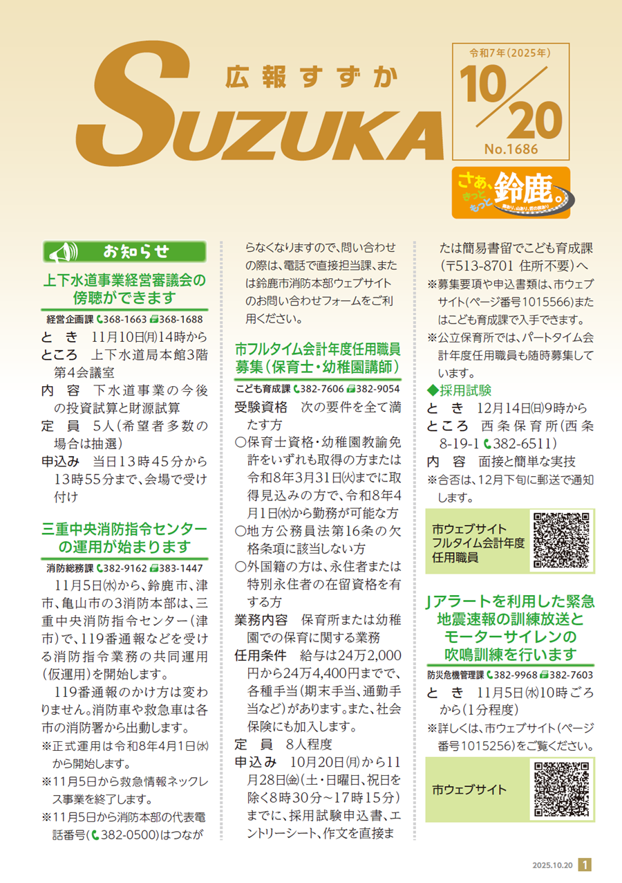 その他のお知らせ(広報すずか 2025年10月20日号(No.1686)) ※「広報すずか」の発行経費の一部に充てるため、有料広告を掲載しています。内容に関する責任は広告主に帰属します。 ※有料広告掲載に関するお問い合わせは、令和7年度広告代理店の株式会社ウィット(【電話】072-668-3275)へ ■さまざまな媒体で情報を発信しています ・LINE公式アカウント ・facebook ・X ・YouTube ・広報すずか電子 ・音声版 ・鈴鹿市公式インスタグラム ※二次...