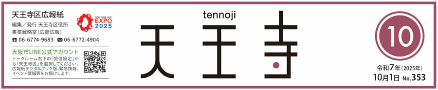 天王寺区でSDGS てんのうじーず! vol.6 ・楽しく子育て ・天王寺区の子育てを応援! ・地域でつながる ◆天王寺区 こどもフェスタ ・申込不要 ・無料 一緒に楽しい時間を過ごしましょう! 日時:2025 11/1(土) 11:00~14:00 場所:天王寺区役所3階講堂 対象:未就学児とその保護者・マタニティママ ◇主なプログラム ・子育て支援サークルPRコーナー ・防災啓発コーナー ・幼稚園・保育所情報コーナー ・子育て支援室・つどいの...