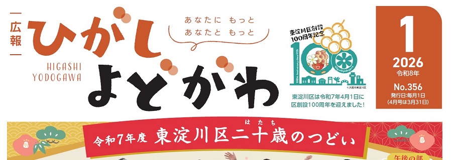 その他 その他のお知らせ(広報ひがしよどがわ 令和8年1月号)(1) ■広報ひがしよどがわ HigashiYodogawa あなたに もっと あなたと もっと 2026年(令和8年)1月号 No.356 発行日:毎月1日(4月号は3月31日) ・東淀川区創設100周年記念ロゴマーク 東淀川区は令和7年4月1日に区創設100周年を迎えました! ■区の面積 ・13.27平方キロメートル 区の人口:178,021人 区の世帯数:105,819世帯(令和7年12月1日現在推...