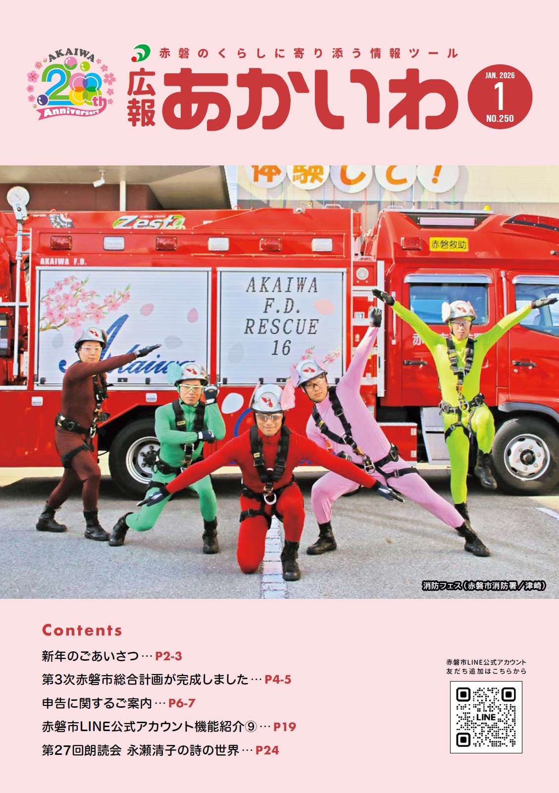 LIFE CALENDAR ライフ・カレンダー ◆1月の休日当番医 診療時間:9:00〜17:00 ※休憩時間あり 問合せ:健康増進課 【電話】955-1117 ◆あかいわ健康・急病相談ダイヤル 【電話】0120-118-384 経験豊富な看護師・保健師などが健康に関する相談に、24時間年中無休で、きめ細かくアドバイスします。 新型コロナウイルス感染症についての一般的な相談も受け付けています。 ※プライバシーは厳守されるシステムになっていますの...