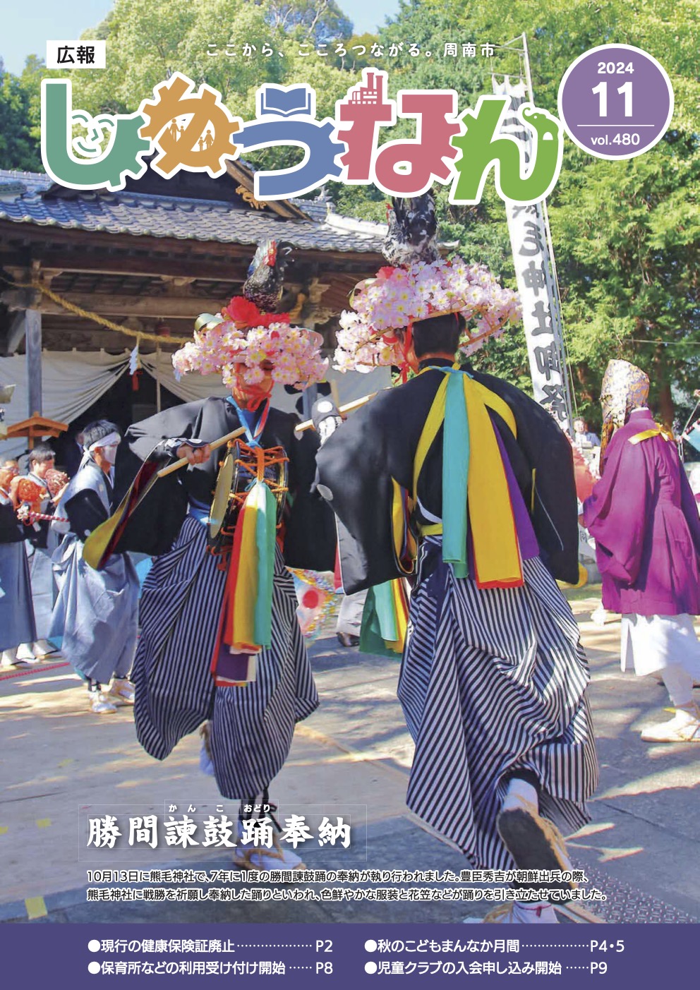 今月の表紙 ■勝間諫鼓踊(かんこおどり)奉納 10月13日に熊毛神社で、7年に1度の勝間諫鼓踊の奉納が執り行われました。豊臣秀吉が朝鮮出兵の際、熊毛神社に戦勝を祈願し奉納した踊りといわれ、色鮮やかな服装と花笠などが踊りを引き立たせていました。