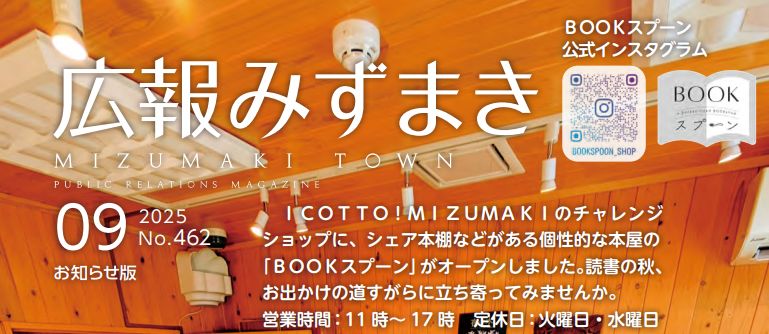 表紙 ■訪れる度に新しい出会いがあるまちの小さな本屋さん ICOTTO!MIZUMAKIのチャレンジショップに、シェア本棚などがある個性的な本屋の「BOOKスプーン」がオープンしました。読書の秋、お出かけの道すがらに立ち寄ってみませんか。 営業時間:11時~17時 定休日:火曜日・水曜日