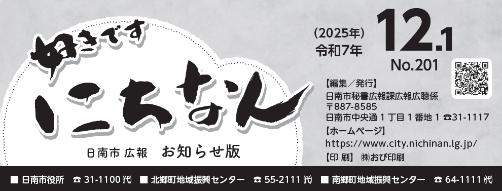 その他のお知らせ(好きですにちなんお知らせ版令和7年12月1日号) ■日南市広報お知らせ版 好きですにちなん(No.201) 2025年12月1日 編集/発行:日南市秘書広報課広報広聴係 〒887-8585 日南市中央通1丁目1番地1 【電話】31-1117 【HP】https://www.city.nichinan.lg.jp/ 印刷:(株)おび印刷 日南市役所【電話】31-1100(代) 北郷町地域振興センター【電話】55-2111(代) 南郷町地域振興センタ...