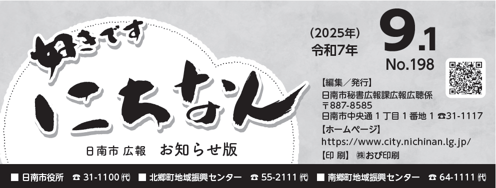 その他のお知らせ(好きです にちなん お知らせ版 令和7年9月1日号) ◆好きですにちなん 日南市広報お知らせ版 2025年9月1日 No.198 編集/発行:日南市秘書広報課広報広聴係 〒887-8585 日南市中央通1丁目1番地1 【電話】31-1117 【HP】https://www.city.nichinan.lg.jp/ 印刷:(株)おび印刷 日南市役所【電話】31-1100(代) 北郷町地域振興センター【電話】55-2111(代) 南郷町地域振興センター【...