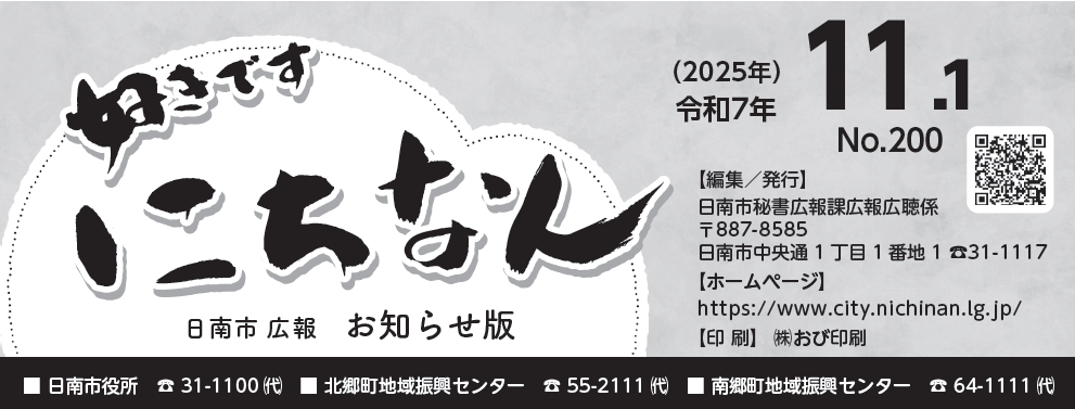 その他のお知らせ(好きです にちなん お知らせ版 令和7年11月1日) ■日南市広報お知らせ版 好きですにちなん 2025年11月1日(No.200) 編集/発行日:南市秘書広報課広報広聴係 〒887-8585 日南市中央通1丁目1番地1 【電話】31-1117 【HP】https://www.city.nichinan.lg.jp/ 印刷:(株)おび印刷 日南市役所【電話】31-1100(代) 北郷町地域振興センター【電話】55-2111(代) 南郷町地域振興センタ...