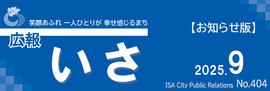 広報紙発送日変更について 広報いさ9月1日号 本紙24ページでお知らせいたしました、広報紙発行回数変更により、月1回の広報紙発行日が毎月15日に変更となります。 ・次号(10月号)発送日 10月15日(水) 今後とも分かりやすく親しみやすい広報紙づくりに努めてまいりますので、引き続きご理解をお願いいたします。