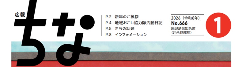 その他のお知らせ(広報ちな 2026年1月号) ■広報ちな 2026(令和8年)1月号 No.666 鹿児島県知名町(沖永良部島) 令和8年1月10日発行 発行・編集:知名町役場企画振興課 〒891-9295鹿児島県大島郡知名町知名1100番地 【電話】0997-84-3162 【FAX】0997-93-4103 【URL】http://www.town.china.lg.jp/