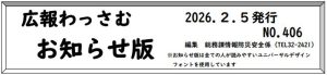 2/9(月)~令和8年度放課後児童クラブ(学童保育)利用受付 放課後児童クラブ(学童保育)の利用受付を開始します。 受付期間:2月9日(月)~2月25日(水)(2月2日(月)から用紙交付) 受付:子育て支援センター「こども館」・和寒町保育所保健福祉課福祉係 提出書類:利用申請書、就労証明書(就労申立書) 対象児童:保護者が就労等により昼間家庭にいない児童(1年生~6年生まで) その他: 現在、放課後児童クラブ(学童保育)を利用しているお子さんも、引き続き利用...