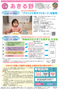 食料品等の物価高騰対策「プリペイド式ギフトカード」を配布 〔大人から子どもまで1人当たり8,000円〕 対象:市の住民基本台帳に登録されている方(令和8年2月1日現在) ※世帯全員分のプリペイド式ギフトカードをまとめて世帯主へ送付します。 配布時期:4月下旬~5月上旬(予定) ギフトカードの利用可能店舗:スーパー、ドラッグストア、コンビニ等で利用できます。 ※一部利用できない店舗があります。 ギフトカードの利用期限:10月31日(土) ※詳細が決まり次第...
