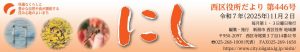 健康と福祉 HEALTH and WELFARE 事業実施について日程などに変更が生じた場合は、西区役所ホームページや西区役所公式エックス、にしっこはぐくみLINKなどでお知らせします。 ■健康相談 健診結果がある人はお持ちください。 ■乳幼児に関する育児相談 ●は栄養相談 ★は歯科相談あり 持ち物:母子健康手帳、バスタオル 申し込み:12月1日(月)から ■妊婦歯科健診 持ち物:母子健康手帳、妊婦歯科健診受診票 申し込み:実施日の2日前までに市...