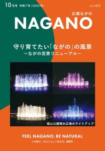 今月の表紙 ながの百景に追加選定された城山公園噴水広場のライトアップは、4月下旬から10月中旬までの毎週金・土曜日18時~20時に行っています。(関連記事31ページ)