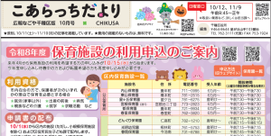 令和8年度 保育施設の利用申込のご案内(1) 来年4月から保育施設の利用を希望する方の申し込みが10月15日(水曜日)から始まります。 今年度申し込みし待機中の方および転園希望の方も再度申し込みが必要です。 ◆利用資格 市内在住の方で、保護者が次のいずれかの理由で保育を必要とする場合 ・就労(家事以外) ・出産の前後 ・病気 ・親族などの介護 ・就学 求職活動 など ◆申請書の配布 10月1日(水曜日)から区内の施設(ただし、小規模保育施設を...